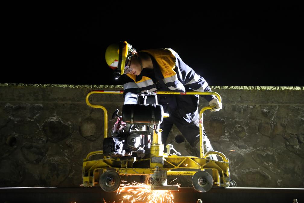 2月11日,日喀則線路工區(qū)職工正在用打磨機(jī)打磨鋼軌焊縫。(拉巴次仁 攝)