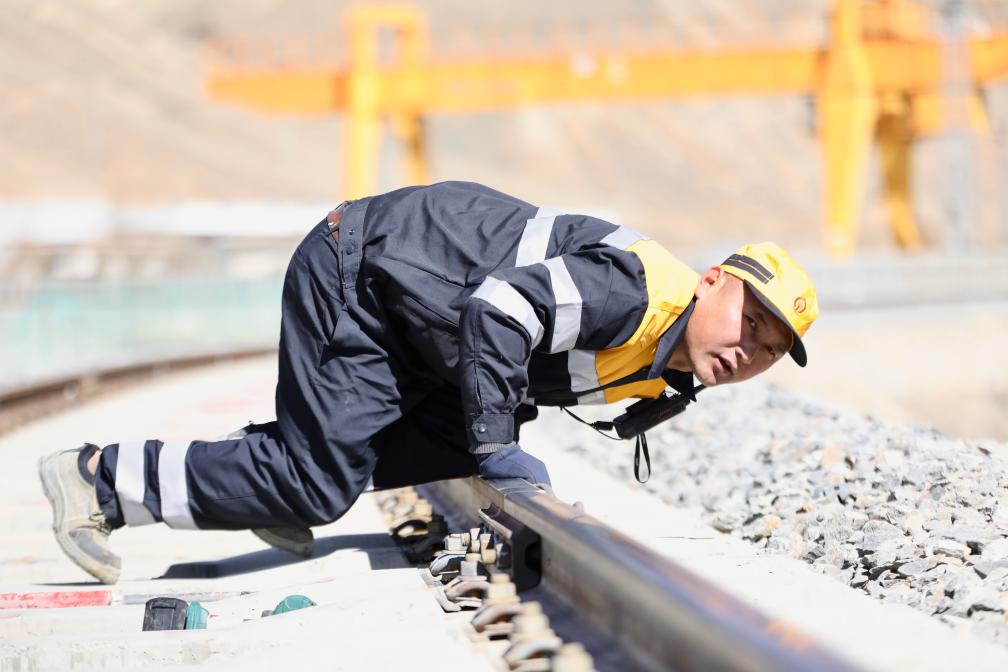 2月11日,日喀則線路工區(qū)工長索朗多布杰正在檢查鋼軌。(拉巴次仁 攝)