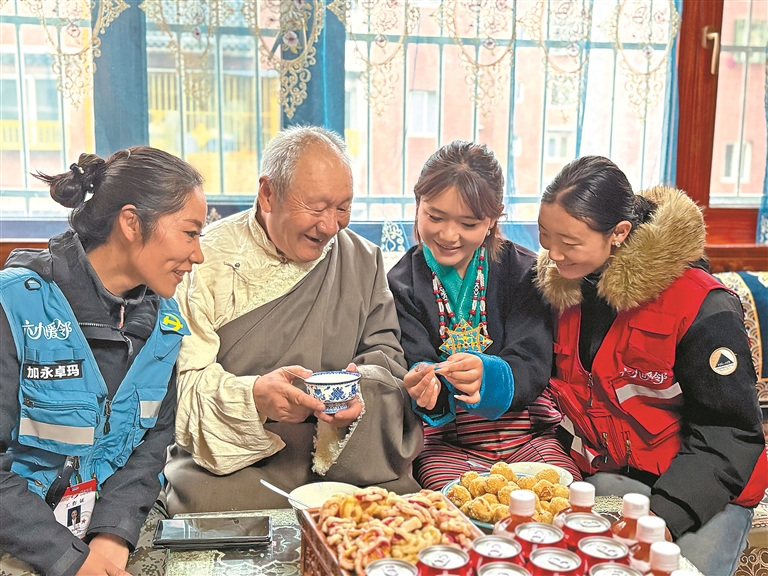 貢布邊點(diǎn)頭邊說:“自從成立了社區(qū)文藝隊(duì)、老年文藝隊(duì)后,大家的精神生活也越來越豐富了,端午包粽子、中秋做月餅,還有奪底洛歐四季‘村晚’、奪底維巴冬日林卡新年音樂會,一場接一場的活動,鄰里之間串門多了、來往勤了,關(guān)系處得比親人還親?!?/p>