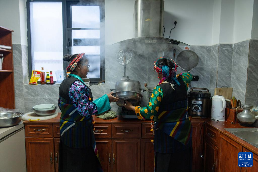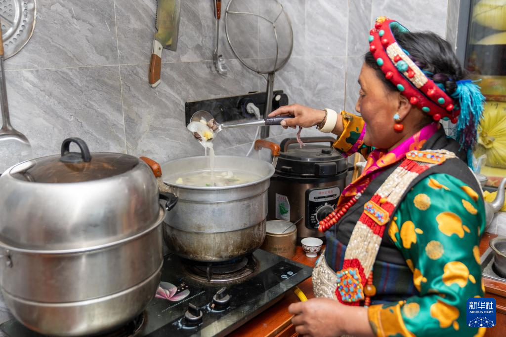 2月16日,長所鄉(xiāng)古榮村村民卓瑪次仁在新居廚房制作年節(jié)食品“古突”。在藏語中,“古”意為“九”,“突”意為“面”,“古突”是一種用牦牛肉湯加入牛肉、蘿卜、奶渣等食材熬煮的面食。按西藏傳統(tǒng)習俗,“古突”夜,家家戶戶迎來團聚,一起享用“古突”。新華社記者 旦增尼瑪曲珠 攝