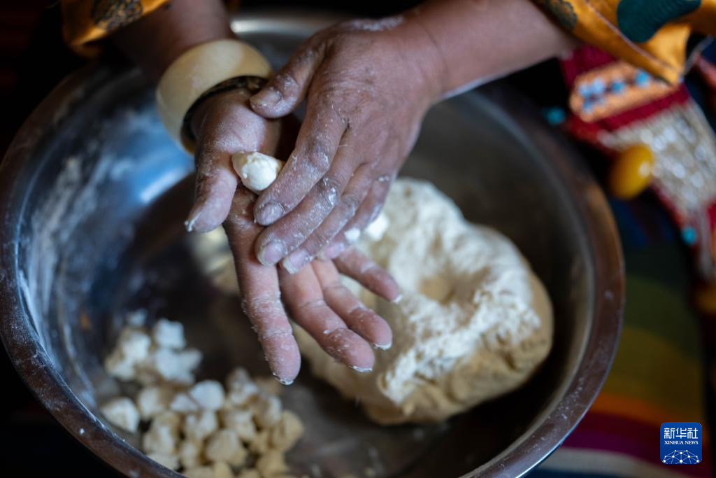 2月16日,長所鄉(xiāng)古榮村村民卓瑪次仁在制作年節(jié)食品“古突”。在藏語中,“古”意為“九”,“突”意為“面”,“古突”是一種用牦牛肉湯加入牛肉、蘿卜、奶渣等食材熬煮的面食。按西藏傳統(tǒng)習俗,“古突”夜,家家戶戶迎來團聚,一起享用“古突”。新華社記者 旦增尼瑪曲珠 攝