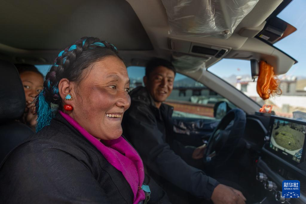 2月16日,長所鄉(xiāng)古榮村村民桑杰(右)帶著愛人卓瑪次仁和小女兒旦增格央去買年貨。新華社記者 旦增尼瑪曲珠 攝
