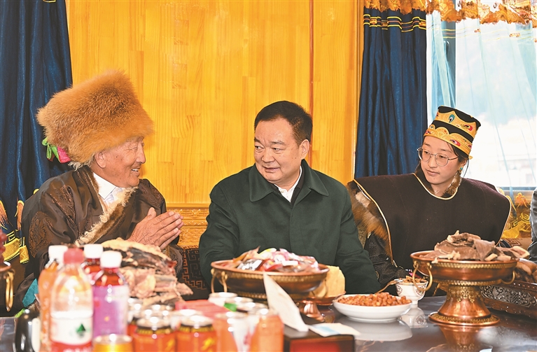 中華民族傳統(tǒng)節(jié)日春節(jié)剛過,雪域高原又迎來了藏歷新年初二,家家戶戶回蕩著“羅薩扎西德勒”的溫馨祝福?!斑^年了,祝你們新年快樂、身體健康、吉祥如意!”王君正走進(jìn)魯朗鎮(zhèn)扎西崗村77歲的老黨員、致富帶頭人平措家里,嶄新的香布、整潔的小院,切瑪斑斕、卡塞飄香,家里充滿濃濃的年味兒?!吧眢w怎么樣?”“民宿生意好不好?”在暖意融融的客廳里,王君正和老人聊家常,詢問身體狀況及家庭收入等情況,隨后走進(jìn)平措家的民宿旅館,從價格、住宿條件到屋外山景,看得仔細(xì)、問得深入。了解到在以習(xí)近平同志為核心的黨中央親切關(guān)懷下,扎西崗村發(fā)生了翻天覆地的變化,平措一家借助本地旅游資源,開民宿、做餐飲,年收入不斷增加,日子越過越好,王君正為他們的發(fā)展感到由衷高興、為他們的幸福生活點贊。他說,“看著北斗星走不迷路、跟著共產(chǎn)黨走會幸?!?,這些好日子,離不開以習(xí)近平同志為核心的黨中央對西藏工作的高度重視、對西藏各族人民的深切關(guān)懷,大家要感恩總書記、感謝黨中央,更加堅定不移聽黨話、感黨恩、跟黨走;黨員要發(fā)揮先鋒模范作用,發(fā)揚(yáng)黨的光榮傳統(tǒng)和優(yōu)良作風(fēng),帶領(lǐng)村民用勤勞的雙手把家園建設(shè)得更加美好,把日子過得更加甜蜜。