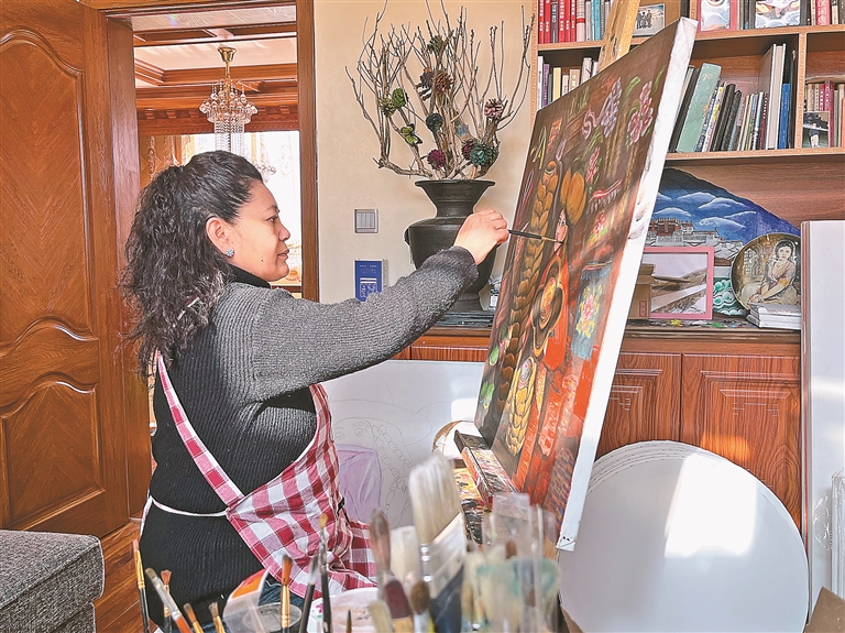 她的創(chuàng)作,始終與腳下土地的變遷同頻共振。從記憶中塵土飛揚(yáng)的拉薩街巷,到如今南北山披綠、現(xiàn)代樓宇與傳統(tǒng)院落和諧共生的新城,她既是見證者,也是記錄者。
