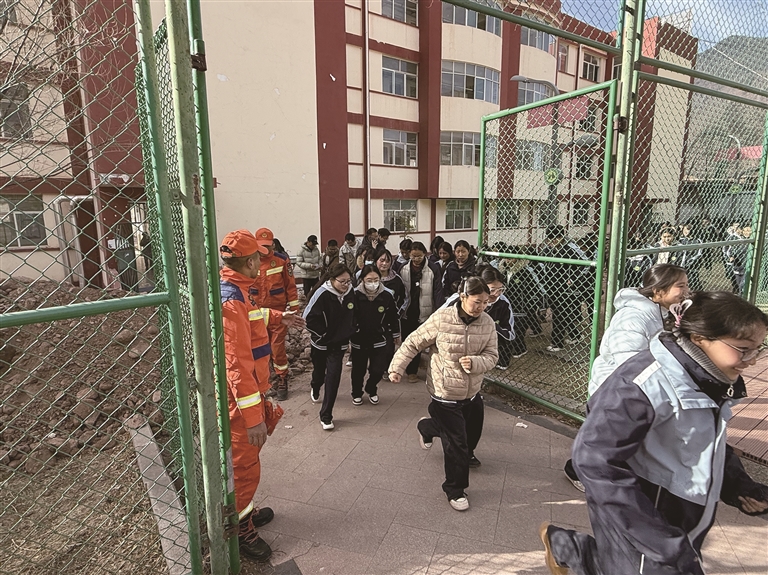 指戰(zhàn)員現(xiàn)場組織開展地震應(yīng)急疏散演練。圖由卡若區(qū)消防救援機動大隊提供