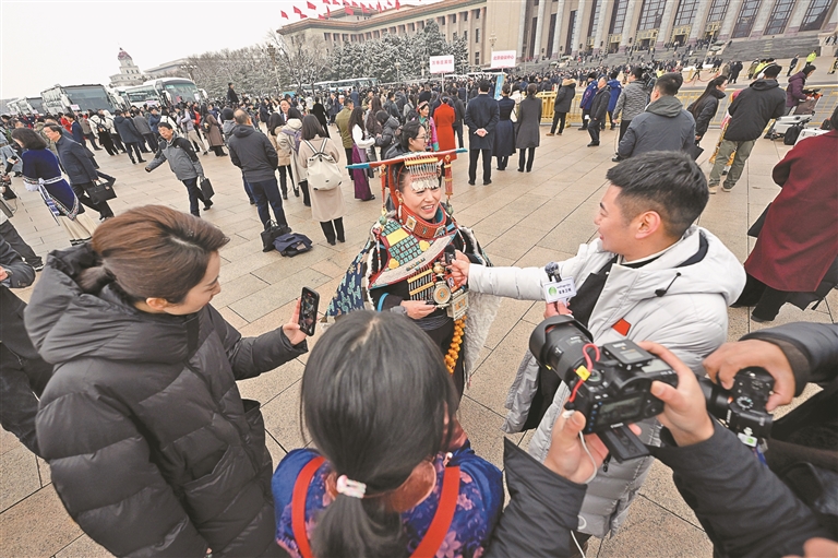 走出人民大會(huì)堂后,代表們?nèi)栽跓崃矣懻摗?/p>