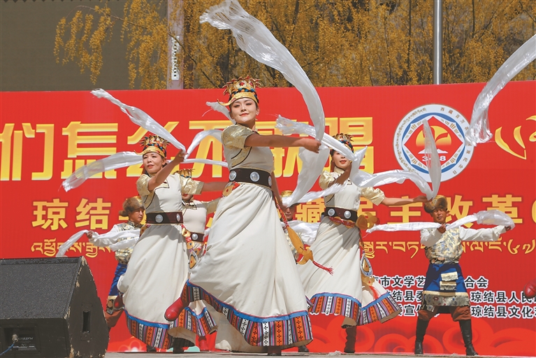 圖為3月27日,山南市瓊結(jié)縣青瓦達(dá)孜廣場上歡歌笑語、人頭攢動。為紀(jì)念西藏民主改革67周年,一場以“叫我們怎么不歌唱”為主題的文藝演出在此舉行。圖為活動演出現(xiàn)場。倫珠澤仁 記者 白瑪澤旺 攝