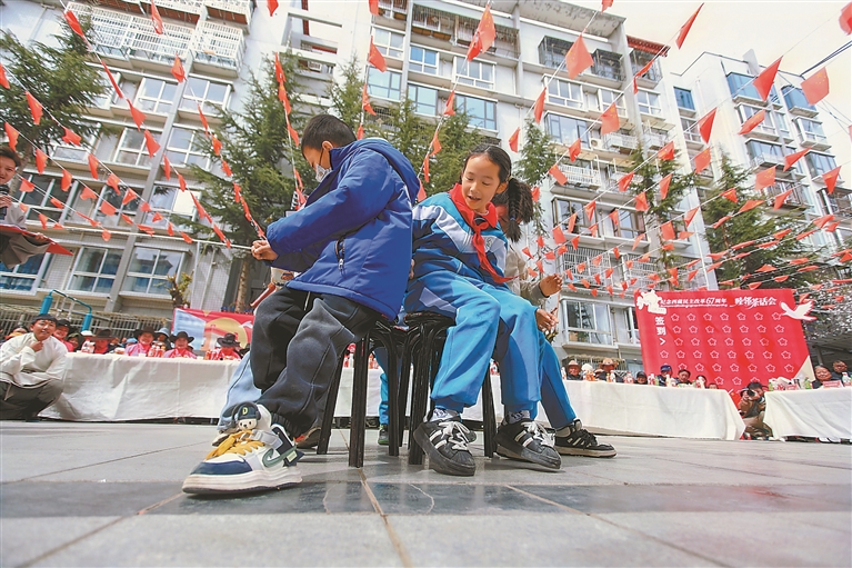 圖為3月27日下午,為紀(jì)念西藏民主改革67周年,城關(guān)區(qū)尼卓林社區(qū)黨總支在蜀園小區(qū)廣場舉辦“銘記歷史·感恩新時代”主題黨日暨“睦鄰茶話會”活動,眾多居民踴躍參與。圖為孩子們在進(jìn)行搶凳子游戲。記者 王敏 攝
