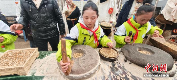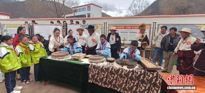 圖為俄洛鎮(zhèn)賽事活動(dòng)中組織學(xué)生體驗(yàn)傳統(tǒng)磨糌粑技能??ㄈ魠^(qū)融媒體中心 供圖