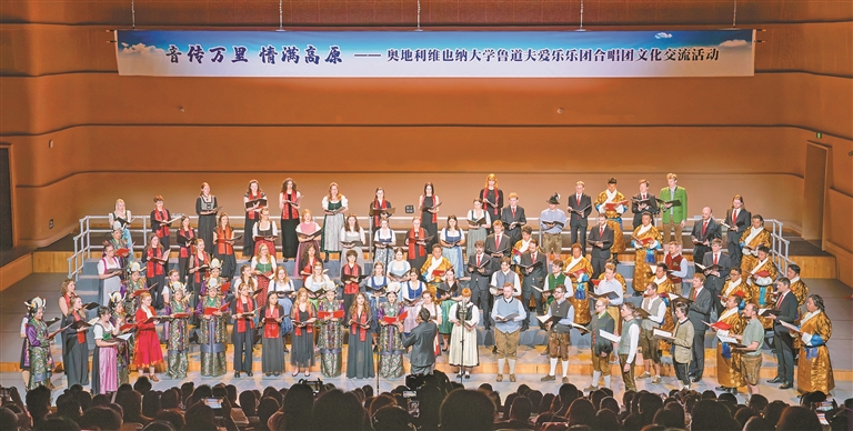 4月3日晚,西藏大劇院內(nèi)歌聲迭起、暖意涌動(dòng)。由自治區(qū)黨委宣傳部、自治區(qū)外事辦公室、自治區(qū)文化和旅游廳主辦,自治區(qū)對(duì)外文化交流協(xié)會(huì)和自治區(qū)歌舞團(tuán)承辦的奧地利維也納大學(xué)魯?shù)婪驉蹣窐穲F(tuán)合唱團(tuán)文化交流活動(dòng)在此舉行。這是中奧兩國藝術(shù)家在雪域高原的首次音樂對(duì)話,更是西藏與世界深情相擁的生動(dòng)縮影。
