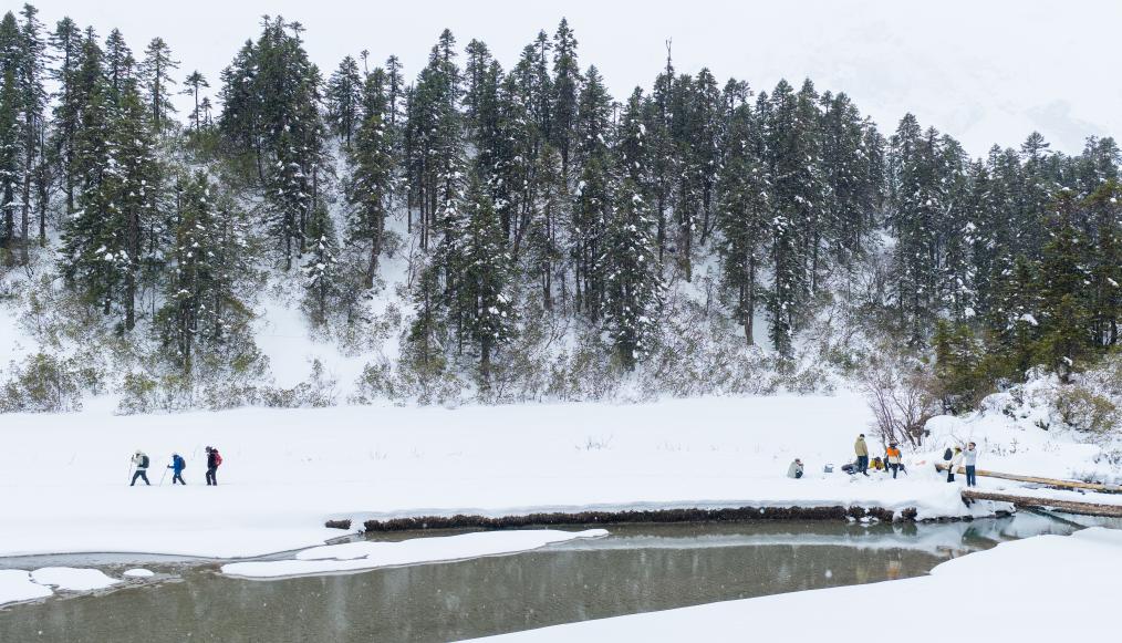 游人在白普隆溝牧場感受雪景(2026年3月21日攝,無人機照片)。新華社記者 普布次仁 攝
