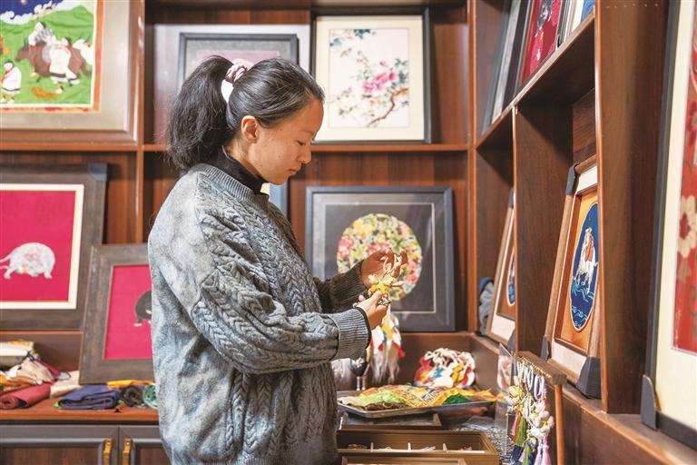 早上9點(diǎn)半,羅布的女兒巴桑德吉準(zhǔn)時(shí)坐在工作臺(tái)前,起稿、裁剪、堆貼、繡制……一枚枚精巧雅致的“堆繡”胸針,在她指尖慢慢成型。在日復(fù)一日的專注與堅(jiān)守中,這位年輕傳承人,正用創(chuàng)新與熱愛,讓古老的傳統(tǒng)手藝煥發(fā)新生。