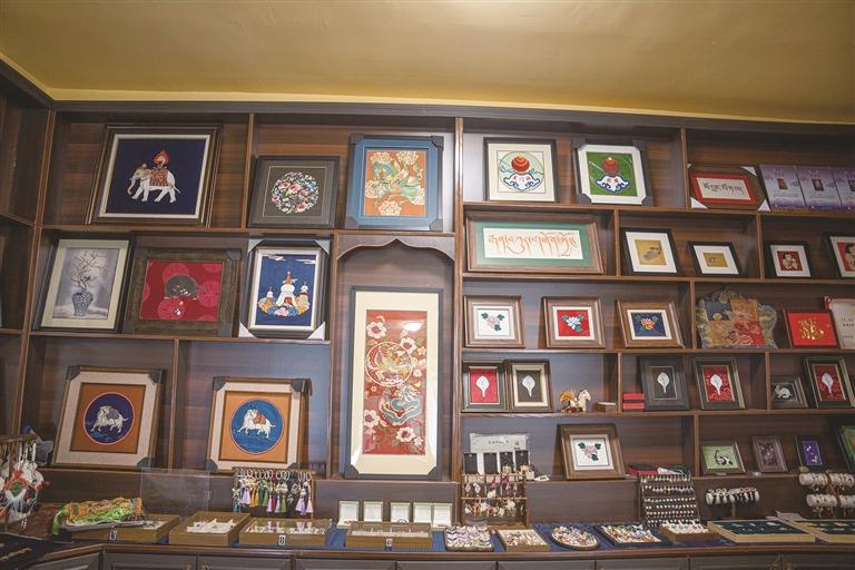 一旁的展示臺(tái)上,各類配飾與胸針錯(cuò)落擺放、琳瑯滿目。東側(cè)墻面上,唐卡、服飾與各式文創(chuàng)產(chǎn)品相映成趣。巴桑德吉告訴記者,拉薩“堆繡”唐卡作為國家級(jí)非遺項(xiàng)目,以堆、貼、繡、嵌為核心工藝,融合多種刺繡技法,用料考究、工序繁復(fù),是西藏極具代表性的文化瑰寶。為守住技藝的原汁原味,團(tuán)隊(duì)始終堅(jiān)持純手工制作、不批量生產(chǎn)、不追求速度,實(shí)行朝九晚六、無硬性任務(wù)的工作模式,杜絕因趕工影響作品質(zhì)量。憑借扎實(shí)手藝與獨(dú)特文化內(nèi)涵,產(chǎn)品深受消費(fèi)者青睞。