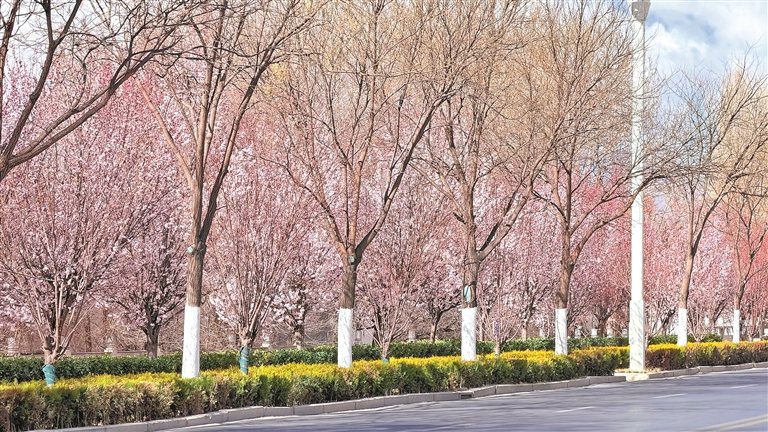 除軍民路外,慈松塘路、貢布堂路、濱河路、羅堆西路、區(qū)直工委路、娘熱北路、農(nóng)科路等道路兩側(cè),紫葉李、桃花也競相綻放。一路走來,道路兩側(cè)的花木被春季染上新的碧綠與粉紅,就連公交車站都被花朵裝點(diǎn)得浪漫雅致,宛如鮮花簇?fù)淼男∥枧_。