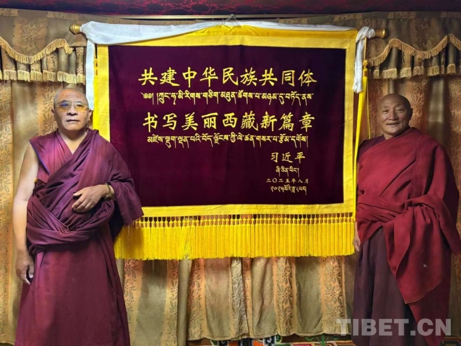 中央代表團向孝登寺贈送了習近平總書記題詞的“共建中華民族共同體 書寫美麗西藏新篇章”賀幛。土登對此深有感觸:“‘共建中華民族共同體’意味著56個民族共同致力于中華民族的偉大夢想;‘書寫美麗西藏新篇章’是指西藏從1965至今發(fā)生巨變,我們正在此基礎上創(chuàng)造更美好的未來?!?nbsp;