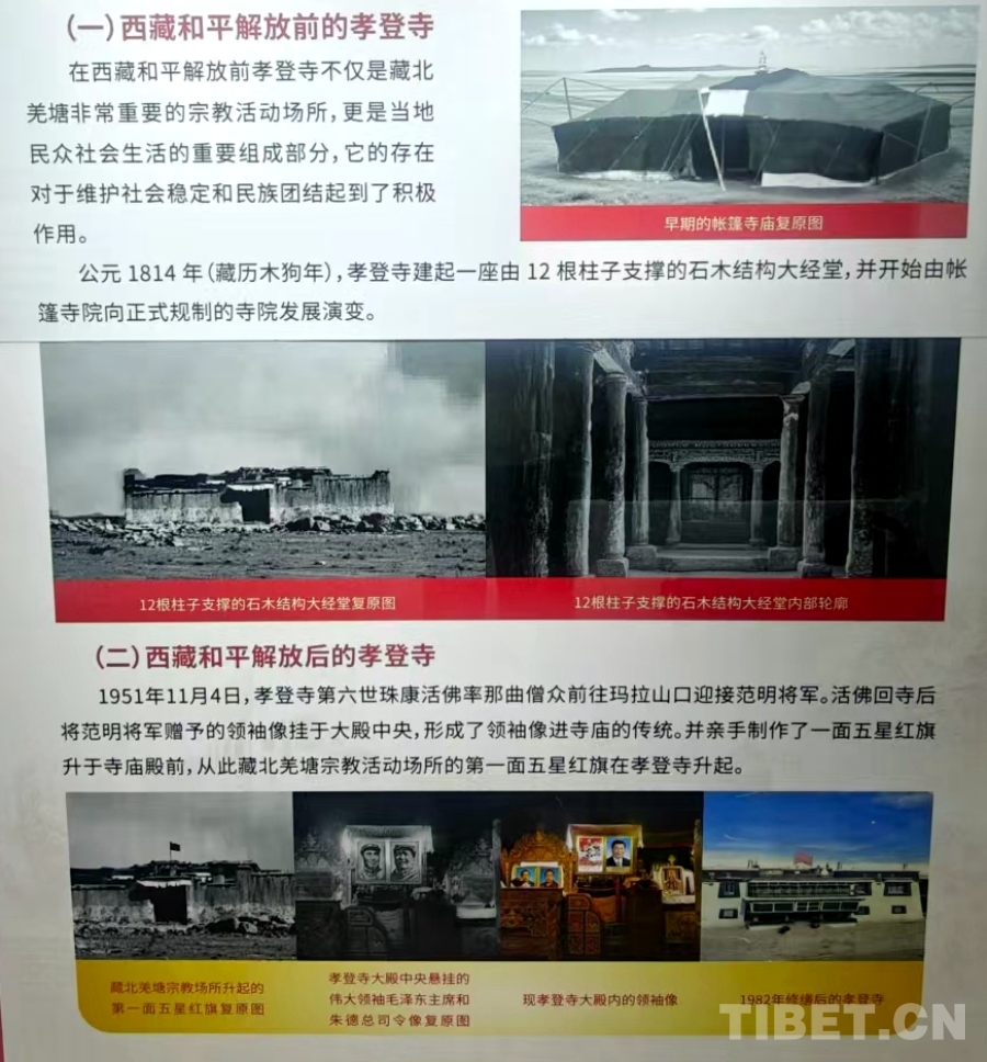 走進孝登寺,主殿正中央懸掛的領袖像莊嚴醒目。據(jù)孝登寺管委會副書記、主任羅布旺秋介紹,1951年,范明將軍率解放軍途經(jīng)那曲時,六世珠康活佛力排眾議前往馬拉山迎接。范明將軍向僧眾宣講黨的民族宗教政策,并向六世珠康活佛贈送了毛主席和朱總司令畫像。此后,六世珠康活佛將領袖像敬懸于大殿正中,這一傳統(tǒng)延續(xù)至今。他還親手制作并升起了藏北寺廟中的第一面五星紅旗。