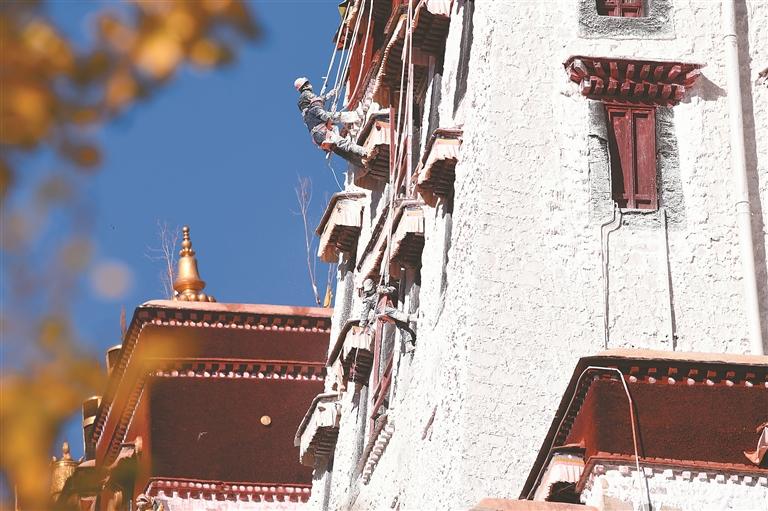 10月22日,拉薩布達(dá)拉宮迎來一年一度的粉刷季,人們手持工具,將涂料逐層涂刷在布達(dá)拉宮墻上。據(jù)了解,布達(dá)拉宮刷墻涂料主要以白灰、紅土和黃土等天然原料為主,為了增加光澤和黏度,調(diào)配過程中還會添加少量的牛奶、白糖、蜂蜜、藏紅花和牛骨膠等,讓涂料更好地附著在墻體上,為布達(dá)拉宮的墻體增添一層保護(hù)。記者 洛桑 唐斌 攝影報道