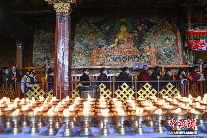 11月28日,西藏拉薩,信眾在大昭寺里排隊朝拜。西藏進(jìn)入冬季農(nóng)閑期,眾多藏傳佛教信眾從各地匯聚到拉薩,圍繞林廓轉(zhuǎn)經(jīng)路、大昭寺等地轉(zhuǎn)經(jīng)、禮佛、朝拜。中新社記者 貢嘎來松 攝