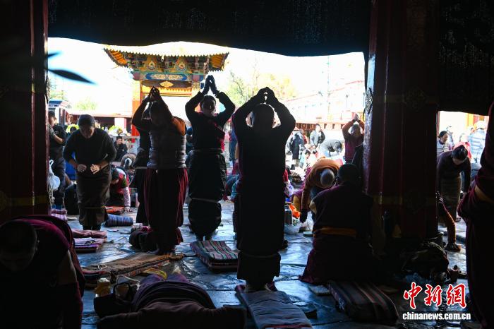11月28日,西藏拉薩,信眾在大昭寺轉(zhuǎn)經(jīng)。西藏進(jìn)入冬季農(nóng)閑期,眾多藏傳佛教信眾從各地匯聚到拉薩,圍繞林廓轉(zhuǎn)經(jīng)路、大昭寺等地轉(zhuǎn)經(jīng)、禮佛、朝拜。中新社記者 貢嘎來松 攝