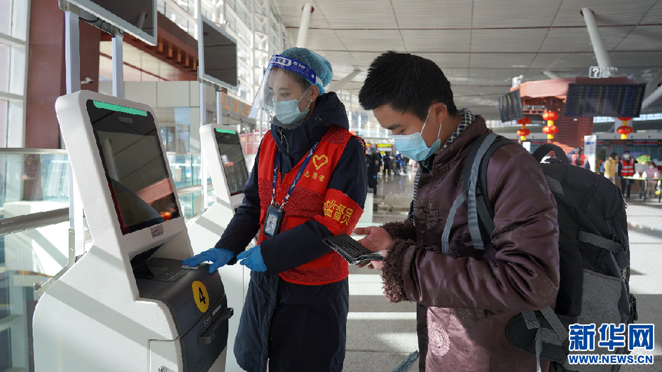 1月17日,志愿者協(xié)助旅客辦理電子乘機手續(xù)。新華網(wǎng) 達珍 攝