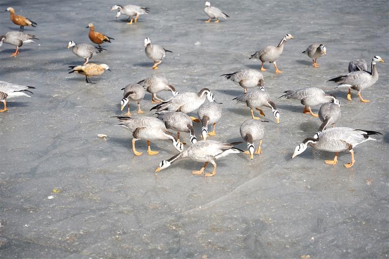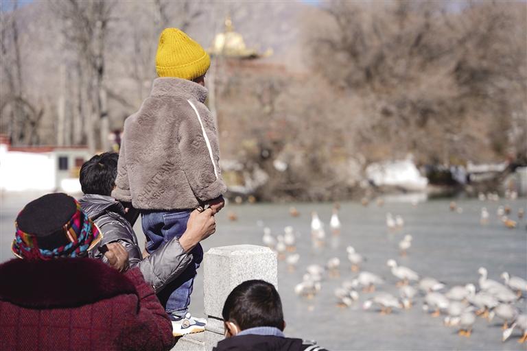 如果你想觀賞候鳥,可以前往拉薩3號(hào)壩橋,清澈的水面上候鳥聚集成群。米瑪頓珠和老伴站立在橋面上,靜靜欣賞著候鳥,時(shí)不時(shí)還有候鳥飛過他們的頭頂,在半空中盤旋一番,再落到水面。