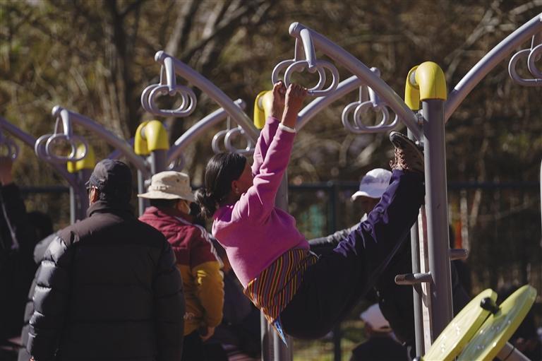 漫步公園,到處都是人們晨練的身影。太極、柔力球、廣場舞,清晨的宗角祿康公園十分熱鬧。在公園一角,還有人在跳鍋莊舞,他們隨著音樂,一會(huì)兒扭胯、一會(huì)兒踢腿、一會(huì)兒擺手……個(gè)個(gè)精神飽滿。