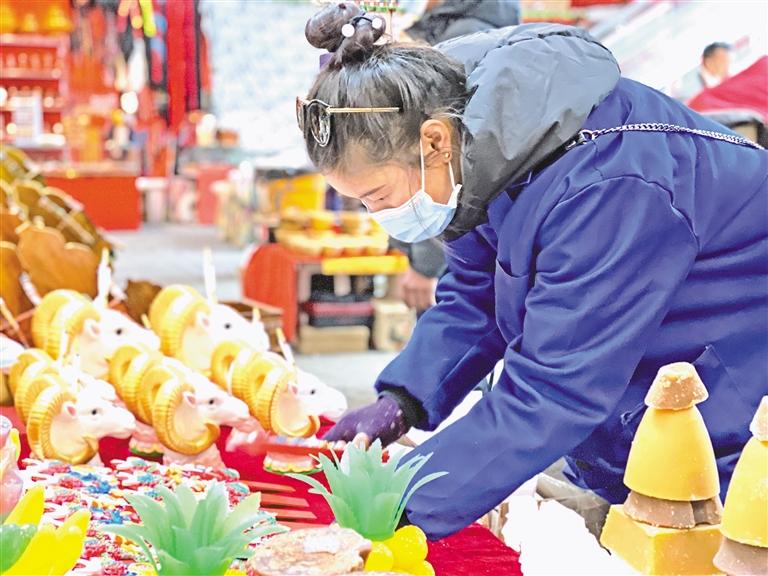 在雪域亙古浩瀚的歷史中,高原兒女自古以來便認(rèn)定“羊”是吉祥的動(dòng)物,代表了藏族群眾祈盼來年五谷豐登、六畜興旺。塑彩羊頭在藏語中稱為“隆果”,一般擺放在新年布置的貢品中央?!鞍謰屓ツ曩徺I了一種用石灰制作的塑彩羊頭,今年我想購買陶瓷制作的塑彩羊頭放在爸媽家,去年買的拿回自己家,這樣既環(huán)保,也讓老人開心?!笔忻袼骼释言谀曦洈偽毁徺I“隆果”時(shí)說。