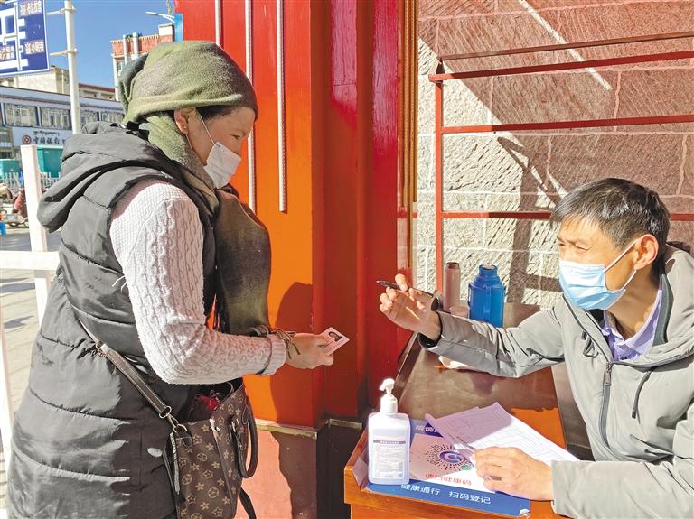 八廓商城市場部部長卓嘎介紹說:“為廣大市民提供一個(gè)安全、祥和的購物環(huán)境,我們在商場設(shè)有5個(gè)進(jìn)出口,每個(gè)進(jìn)出口都需掃行程碼、測量體溫后才可進(jìn)入。因?yàn)橛行├先藳]有智能手機(jī),無法掃健康瑪,我們會(huì)登記姓名、身份證號(hào)、聯(lián)系方式。并且在增加的攤位旁增設(shè)消防器材,不定時(shí)巡邏?!?/p>