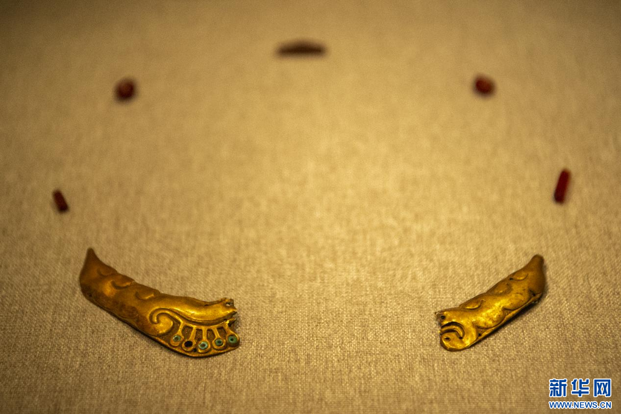 西藏阿里博物館展品,從曲踏墓葬出土的“金掛飾”(8月23日攝)。新華網 旦增努布 攝