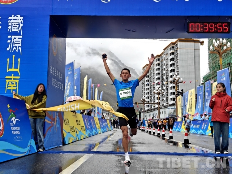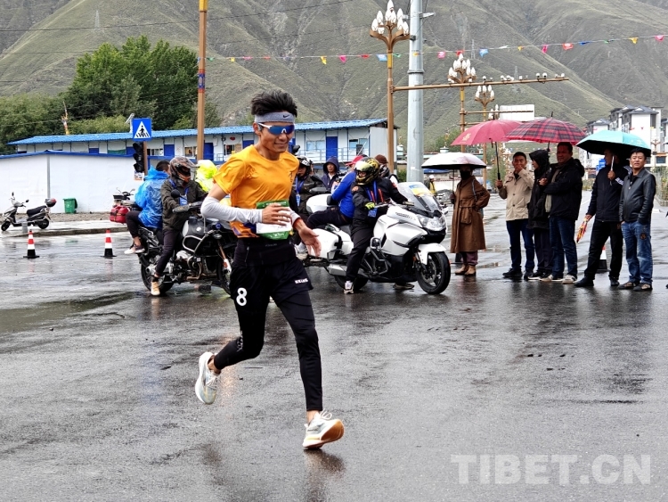 圖為競速跑11公里男子組第一名格桑旺堆抵達終點 攝影:次旦拉姆
