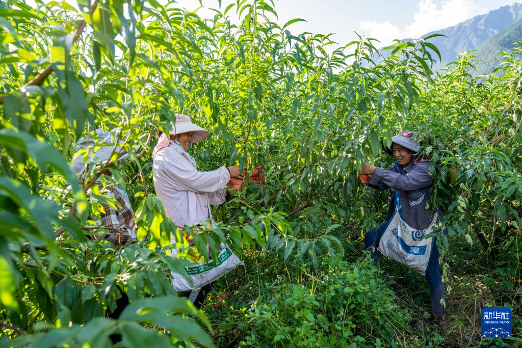 在西藏察隅縣下察隅鎮(zhèn),當(dāng)?shù)卮迕裾诓烧S桃(9月3日攝)。新華社記者 孫非 攝