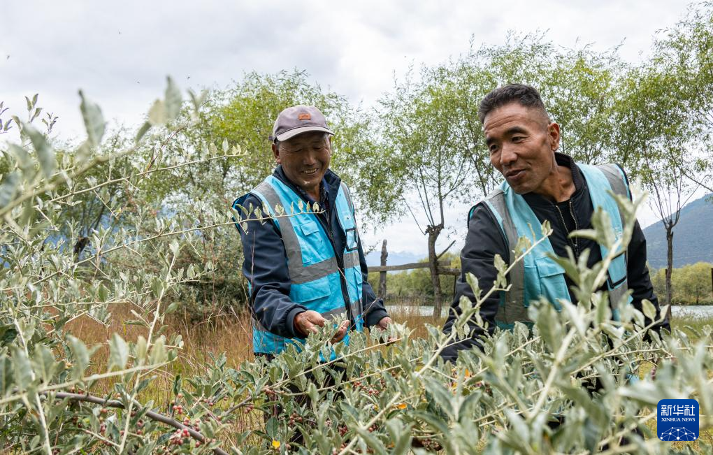 雅尼國家濕地公園管護員普布多杰(右)和同事在巡護途中查看樹木長勢(9月8日攝)。新華社發(fā)(丁增尼達 攝)