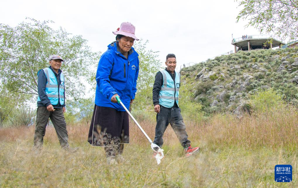 雅尼國家濕地公園管護員普布多杰(左)在巡護途中清理垃圾(9月8日攝)。新華社發(fā)(丁增尼達 攝)