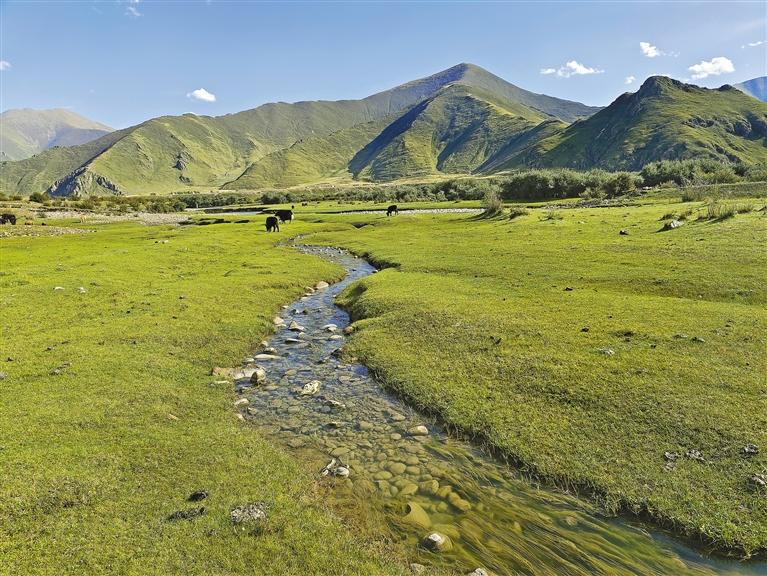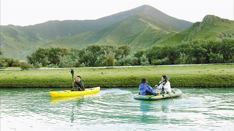 位于布崗村的渠嚓埠濕地,因其眾多島嶼分割水系形成淺灘,讓河水經(jīng)過時(shí)變得平緩,在陽光照射下水溫升高,綠樹成蔭、草地肥美,是戶外水上運(yùn)動(dòng)的絕佳場(chǎng)所,游客在享受淺灘漂流的舒適中感受大自然的魅力。草地像是一幅巨大的毯子又寬又平,牦牛在草地上悠閑覓食,黑色點(diǎn)點(diǎn),將草地點(diǎn)綴得十分美麗。
