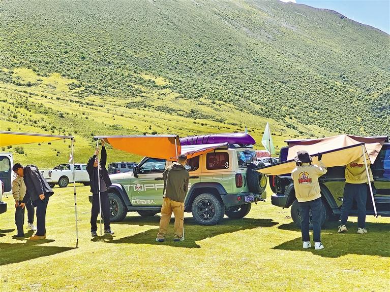 覺丹峰的對(duì)面是一大片平整的壩子,在志愿者的引導(dǎo)下,車友們將車輛有序停放好,迫不及待地開始搭設(shè)帳篷、側(cè)邊天幕等露營裝備。
