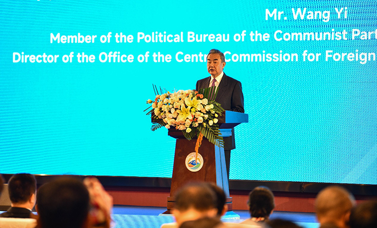 圖為開(kāi)幕式暨主旨論壇現(xiàn)場(chǎng)中共中央政治局委員、中央外事工作委員會(huì)辦公室主任、外交部部長(zhǎng)王毅在致辭 攝影:新華社記者晉美多吉