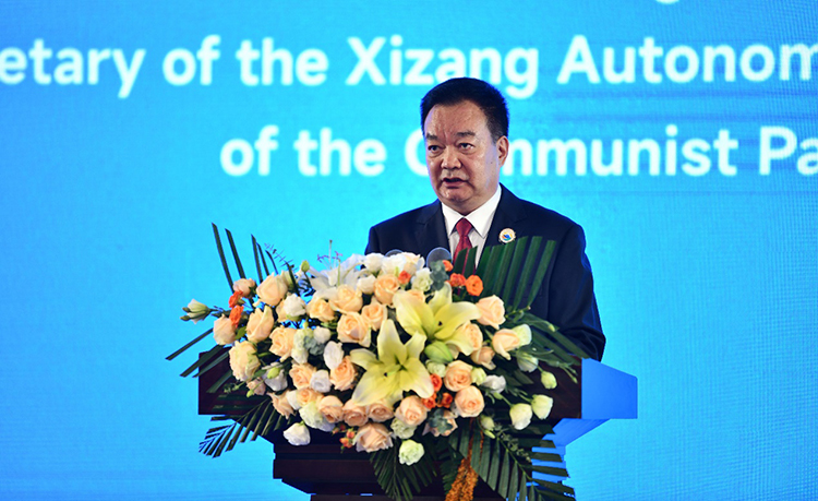 圖為開(kāi)幕式暨主旨論壇現(xiàn)場(chǎng)西藏自治區(qū)黨委書(shū)記王君正在致辭 攝影:新華社記者晉美多吉