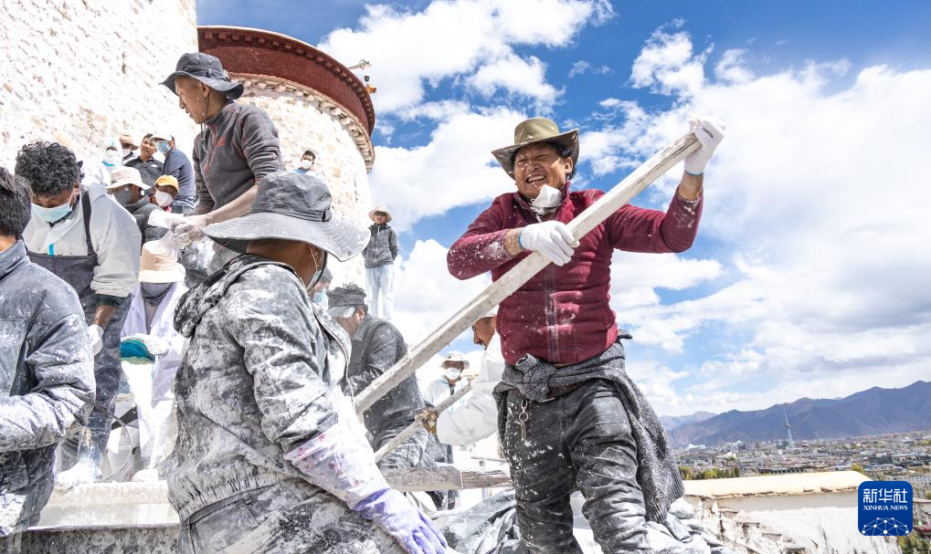 近日,西藏布達(dá)拉宮開始進(jìn)行粉刷維護(hù)工作。為使經(jīng)過一年日曬雨淋的紅墻白壁保持鮮亮光彩,每年秋冬交替時節(jié),布達(dá)拉宮外墻都要進(jìn)行粉刷“美容”。
