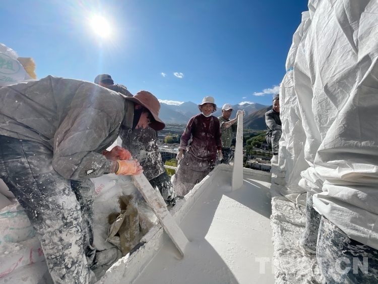 從10月18開(kāi)始,很多信教群眾和工作人員穿著大褂,或背著裝了白色液體的大桶小桶、或抱著裝了白糖蜂蜜等大袋小袋,紛紛走向布宮的每個(gè)角落,加入到粉刷布達(dá)拉宮外墻的工作中。
