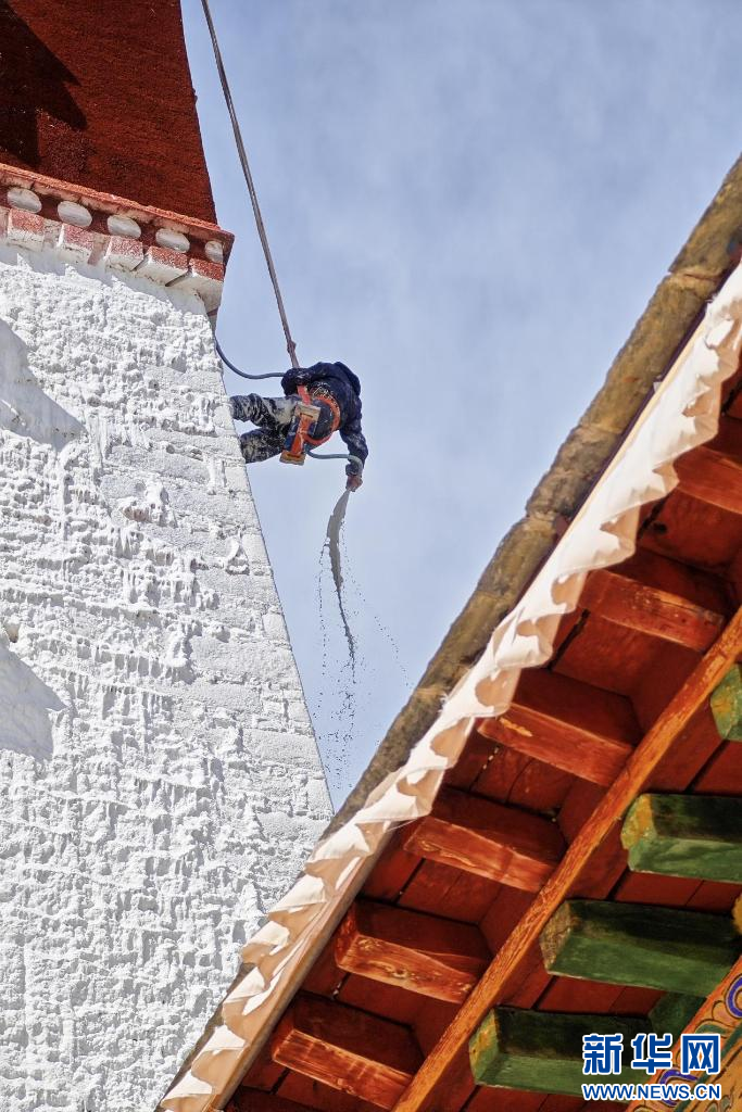 10月18日,布達(dá)拉宮“美容師”在噴灑涂料。新華網(wǎng) 柑丹鴦琦 攝 ??