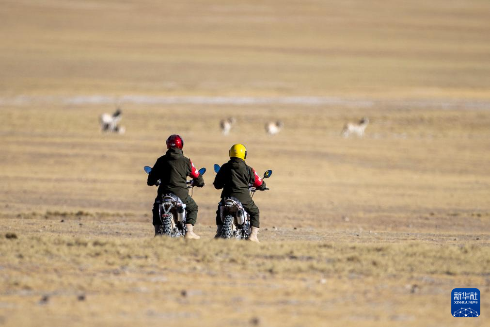 在羌塘國(guó)家級(jí)自然保護(hù)區(qū),野生動(dòng)物管護(hù)隊(duì)員騎著摩托車觀察藏羚羊(12月17日攝)。新華社記者 姜帆 攝