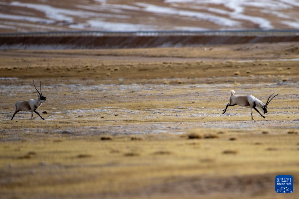 在羌塘國(guó)家級(jí)自然保護(hù)區(qū),兩只雄性藏羚羊?yàn)闋?zhēng)奪交配權(quán)而相互追逐(12月16日攝)。新華社發(fā)(旦增努布 攝)