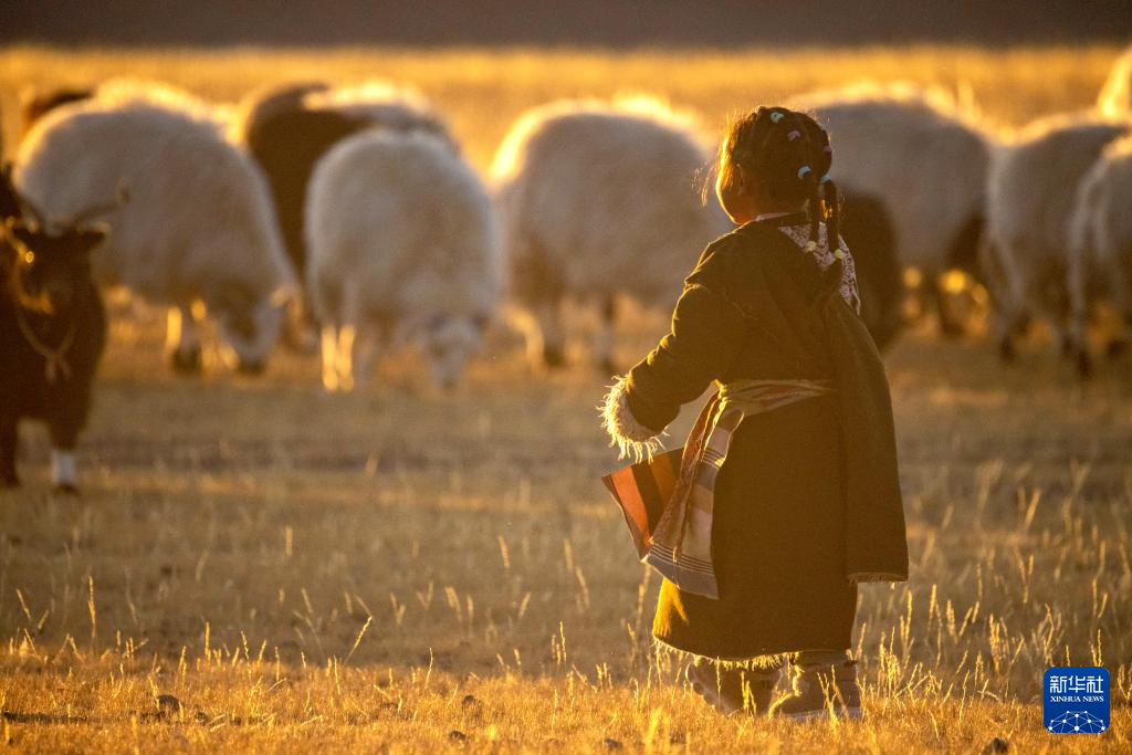 太陽落山,丹增的妹妹、4歲的拉姆卓瑪奔向牧歸的羊群(12月18日攝)。新華社記者 姜帆 攝
