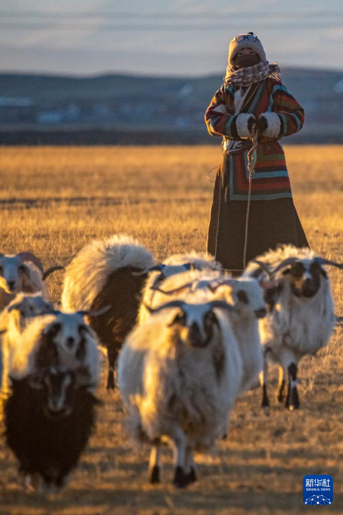 太陽落山,丹增家的羊從草場趕回棚圈(12月18日攝)。新華社記者 姜帆 攝