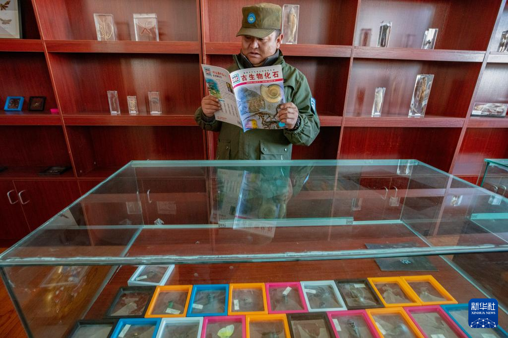 格桑倫珠在站里收集的化石標本前看書(12月21日攝)。新華社記者 姜帆 攝