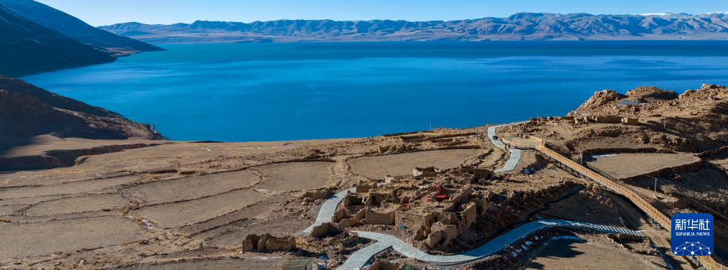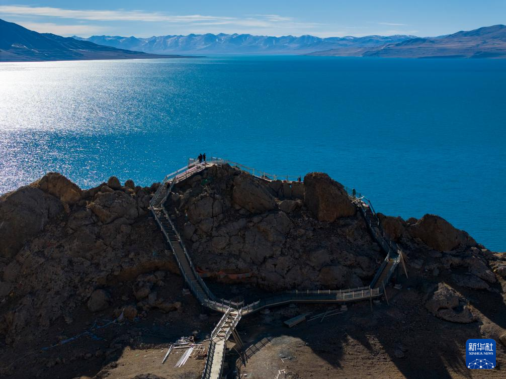 這是當(dāng)惹雍錯旁剛剛竣工的棧道和觀景臺(無人機(jī)照片,12月20日攝)。新華社記者 格桑朗杰 攝