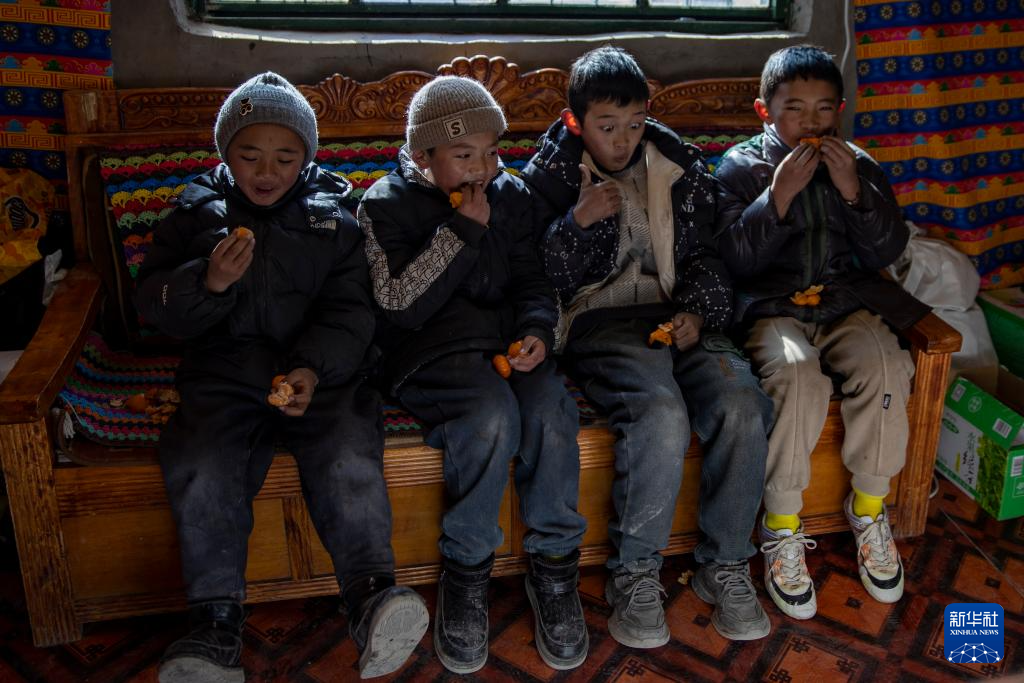 申扎縣馬躍鄉(xiāng)貝嘎四村的幾名小朋友在村里的“偏遠(yuǎn)鄉(xiāng)鎮(zhèn)果蔬配送試點(diǎn)項目”直銷點(diǎn),買來當(dāng)天供銷合作社配送來的新鮮水果品嘗(1月5日攝)。新華社記者姜帆 攝