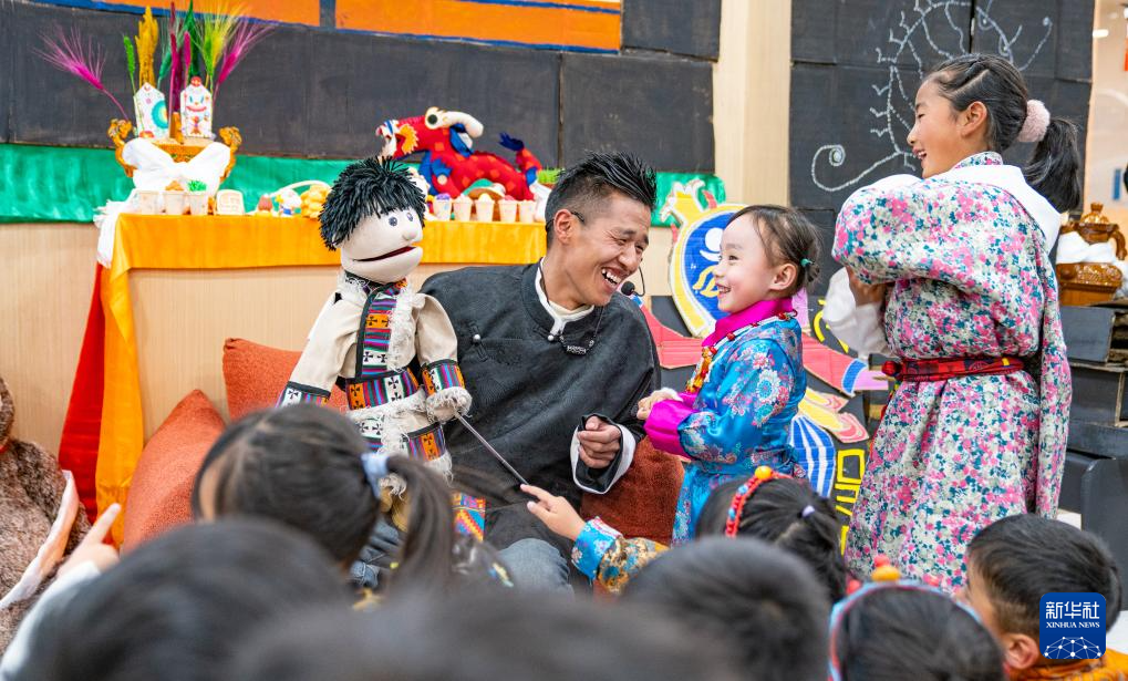 2月3日,手偶表演演員在拉薩的兒童藏裝派對(duì)上和孩子們互動(dòng)。新華社記者 丁增尼達(dá) 攝