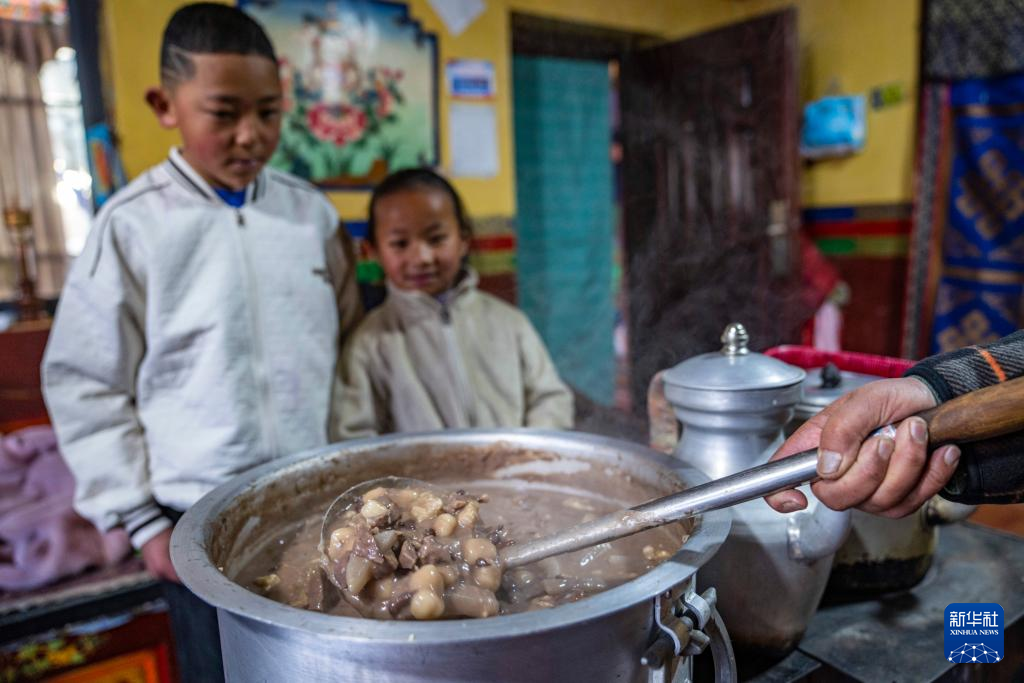 在位于西藏拉薩市當雄縣公塘鄉(xiāng)甲根村的家中,斯曲旺姆的重孫子和重孫女在等待“古突”上桌(2月8日攝)。新華社記者 孫非 攝 ??