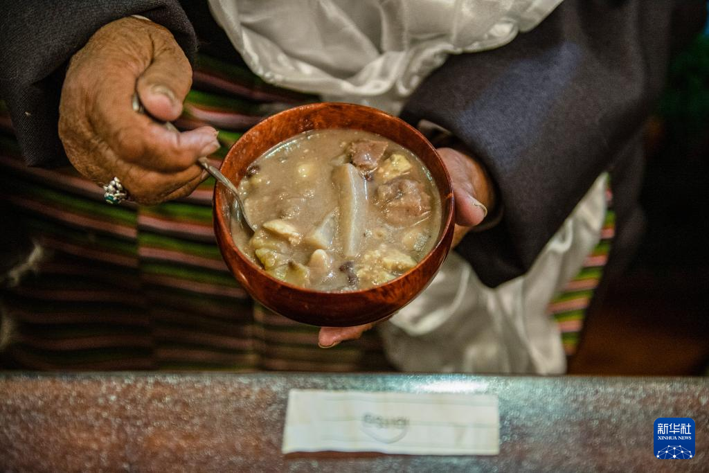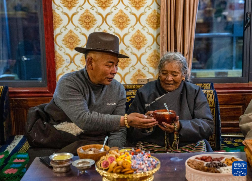 在位于西藏拉薩市當雄縣公塘鄉(xiāng)甲根村的家中,斯曲旺姆的兒子索朗羅達為母親端上“古突”(2月8日攝)。新華社記者 孫非 攝 ??